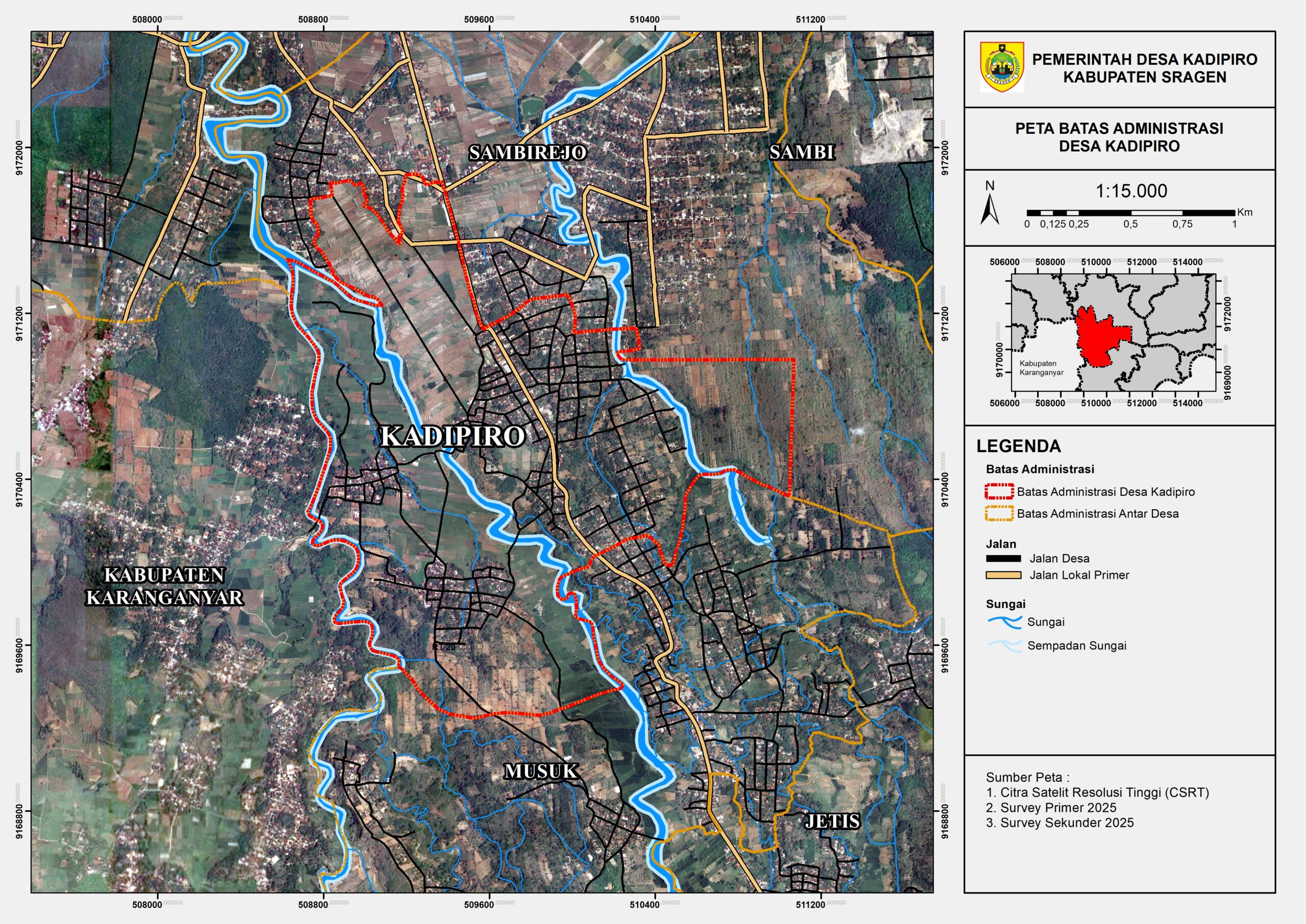 Desa Kadipiro terletak di sebelah selatan ibu kota Kabupaten Sragen, Jawa Tengah, sebagai bagian dari Kecamatan Sambirejo. Desa ini berjarak sekitar 12,5 kilometer dari pusat kota Sragen dengan waktu tempuh sekitar 20 menit menggunakan kendaraan. Wilayahnya berbatasan dengan Desa Tawangsari di Kecamatan Kerjo Kabupaten Karanganyar sebelah barat, Desa Sambirejo di utara, Desa Musuk di selatan, dan Desa Jetis di sebelah timur. Dengan luas wilayah mencapai 3,5 kilometer persegi, lahan di Desa Kadipiro dimanfaatkan untuk berbagai keperluan seperti pemukiman warga, lahan pertanian, fasilitas umum, serta area pendukung kegiatan ekonomi. Desa ini terbagi menjadi sembilan dukuh yang dikelola melalui 24 RT.